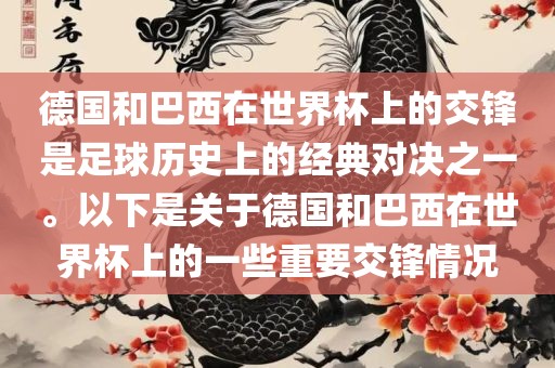 德国和巴西在世界杯上的交锋是足球历史上的经典对决之一。以下是关于德国和巴西在世界杯上的一些重要交锋情况