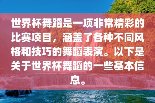 世界杯舞蹈是一项非常精彩的比赛项目,涵盖了各种不同风格和技巧的舞蹈表演。以下是关于世界杯舞蹈的一些基本信息。