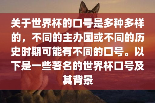 除此之外,每一届世界杯也都有自己的独特口号,旨在表达主办国对足球的热情和对世界杯的期待,这些口号不仅代表了世界杯的精神和文化内涵,也成为了世界杯历史的重要组成部分,如果您对某一届世界杯的口号有更具体的问题,欢迎继续向我提问。