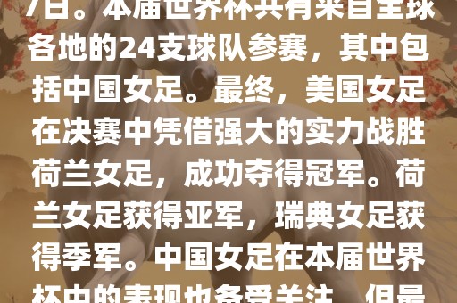 摘要:2019年女足世界杯在法国举行,是首次在欧洲举办的世界杯。比赛时间为一个月,共有来自全球各地的24支球队参赛,包括中国女足。美国女足夺冠,荷兰和瑞典分别获得亚军和季军。中国女足表现备受关注但未进八强。本届世界杯还创造了多项纪录和亮点。