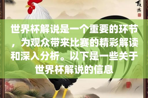 世界杯解说是一个重要的环节,为观众带来比赛的精彩解读和深入分析。以下是一些关于世界杯解说的信息