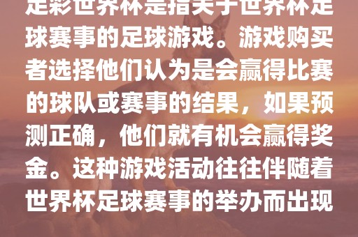 摘要:足彩世界杯是一种基于世界杯足球赛事的足球游戏,玩家通过预测比赛结果来参与游戏,有机会赢得奖金。这种游戏活动通常伴随着世界杯足球赛事的举办而出现,玩家可以选择他们认为会获胜的球队或赛事结果。