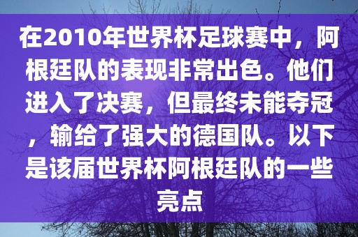 在2010年世界杯足球赛中,阿根廷队的表现非常出色。他们进入了决赛,但最终未能夺冠,输给了强大的德国队。以下是该届世界杯阿根廷队的一些亮点