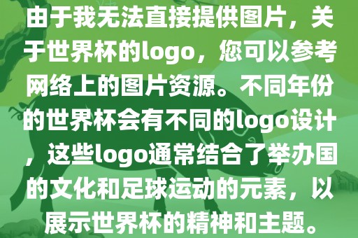 由于我无法直接提供图片,关于世界杯的logo,您可以参考网络上的图片资源。不同年份的世界杯会有不同的logo设计,这些logo通常结合了举办国的文化和足球运动的元素,以展示世界杯的精神和主题。