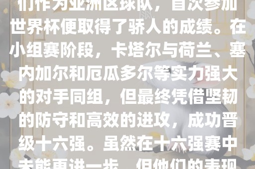 关于卡塔尔在2022年世界杯的表现,可以说是非常出色的。他们作为亚洲区球队,首次参加世界杯便取得了骄人的成绩。在小组赛阶段,卡塔尔与荷兰、塞内加尔和厄瓜多尔等实力强大的对手同组,但最终凭借坚韧的防守和高效的进攻,成功晋级十六强。虽然在十六强赛中未能更进一步,但他们的表现已经赢得了球迷和对手的尊重。