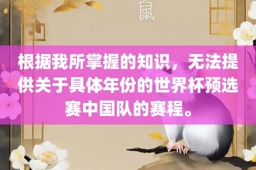 摘要:关于具体年份的世界杯预选赛中国队的赛程,由于信息有限,无法提供确切年份的赛程。需要关注相关体育新闻或官方渠道以获取最新信息。