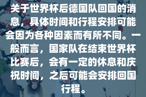 关于世界杯后德国队回国的消息,具体时间和行程安排可能会因为各种因素而有所不同。一般而言,国家队在结束世界杯比赛后,会有一定的休息和庆祝时间,之后可能会安排回国行程。
