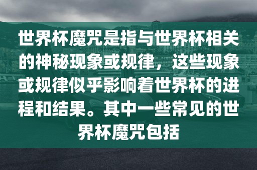 世界杯魔咒是指与世界杯相关的神秘现象或规律,这些现象或规律似乎影响着世界杯的进程和结果。其中一些常见的世界杯魔咒包括